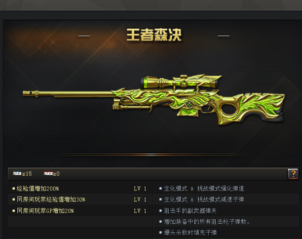 王者森决可使用AWM-裁决作为材料用60颗王者之石进行觉醒,在觉醒后可拥有生化模式&挑战模式的强化弹道&减速子弹,再加上比英雄级Barrett更高的命中头部伤害,王者森决在生化模式中的表现十分抢眼。