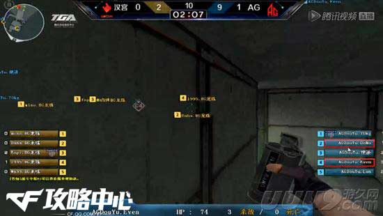 上半场,作为潜伏者的AG战队主动出击抱团进攻,在A区获得优势,继而连拿两分。第三局,作为保卫者的汉宫,队员大米在B门的三杀帮助汉宫扳回1分。第四局AG开局不利,汉宫连续击杀AG两人,但是AG战队凭借强大的残局处理能力3V5胜利,比分3:1。整个上半场,AG凭借强大的个人能力还有默契的团队配合,再加上对残局的掌控,以7:2大比分拿下上半场。