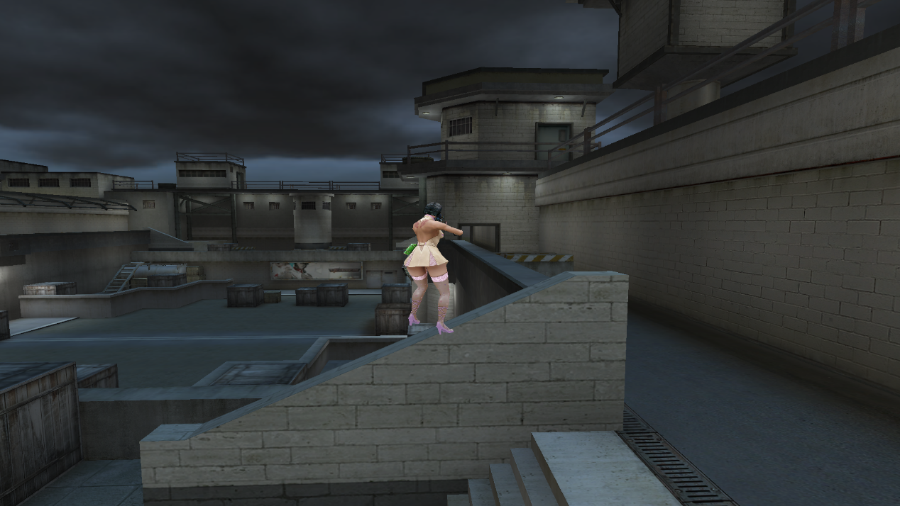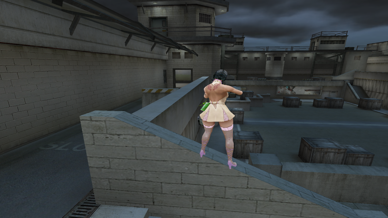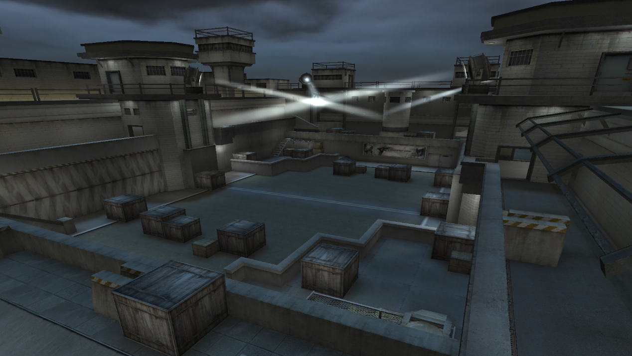 楼梯边上的墙就是斜墙,因为他有个大斜面所以叫斜墙。斜墙在地图里有四面,两种样式,一个阵营的左右两个楼梯上各有一个斜面在不同方向的。
