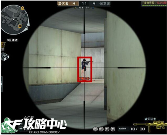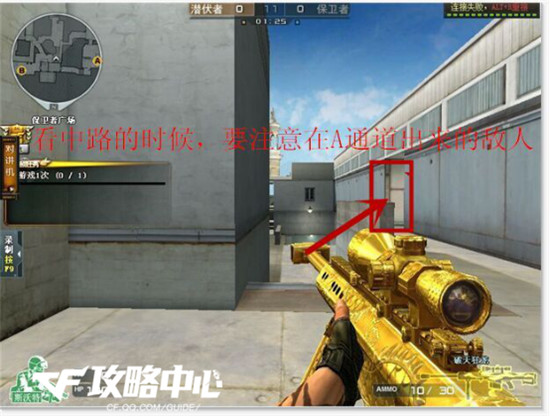 这个位置,一开局就是保卫者去A通道的必经之路,在这里大多数都是狙击手交锋。不过潜伏者会比自己快到2-3秒时间,潜伏者也会架一把狙击蹲着,我建议要闪蹲,让对方先开几枪,然后立刻出去击杀。但是要小心在A通道过来的敌人。