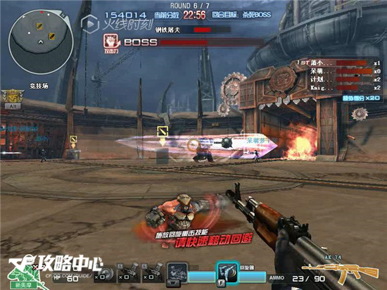 钢铁屠夫的主要输出技能有三个,分别是致命冲撞、火焰炮弹和回旋重击,在这三个技能中我个人认为最鸡肋也是最喜感的就是回旋重击这个技能了,这个技能不仅对玩家造成的伤害很低,而且BOSS在施放技能之后还会有一个跟眩晕一样的感觉,会撑一下地,这时就是他施放技能之后的僵直时间,玩家可以乘机向他疯狂的倾泻火力而不必担心他的报复。