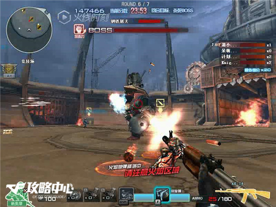 接下来我要重点提醒玩家朋友们注意的就是火焰炮弹这个技能,当钢铁屠夫施放这个技能之前,技能落点的敌方会有明显的红圈标示,所以玩家们只需要通过简单的滑行就可以有效的躲避伤害,所以初期的一段伤害并没有什么需要注意的地方,重点就在于这个炮击区域爆炸之后会有很短的一段着火时间,旁边的队友如果跑位不注意的话很容易莫名其妙的就在那掉血,这血掉的真冤。