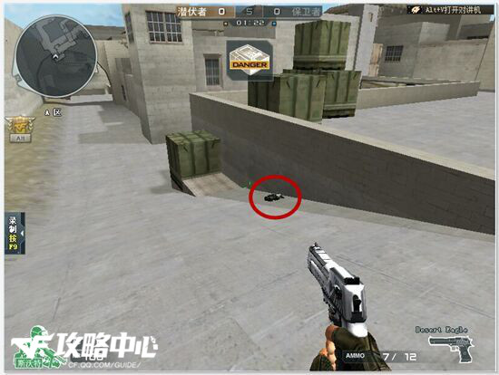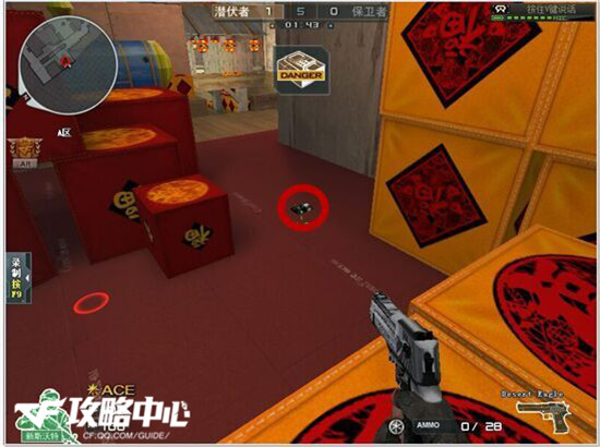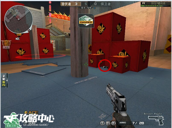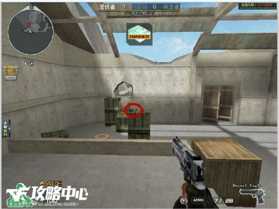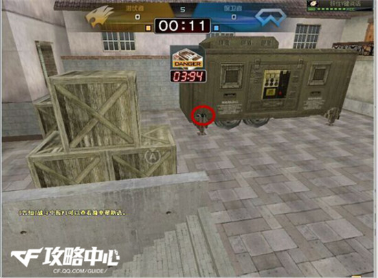 如图:“安放C4后,迅速跑到A坑进行蹲守。推荐下这个包不要下在箱子下面,要下就下在箱子前一点。能保证A坑可以看见。保卫者在拆包的时候会暴露自身目标,潜伏者可以在远处守株待兔,建议使用狙击。”