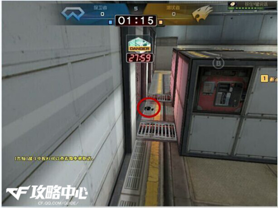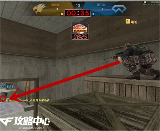 如图:“在卫星基地的B包点里,把包下在铁箱边缘。然后迅速跑到B仓口躲着。每到二至三秒出来观察一下。但是唯一要注意的就是下包的时候,要靠近铁箱边缘,防止别人偷包。”