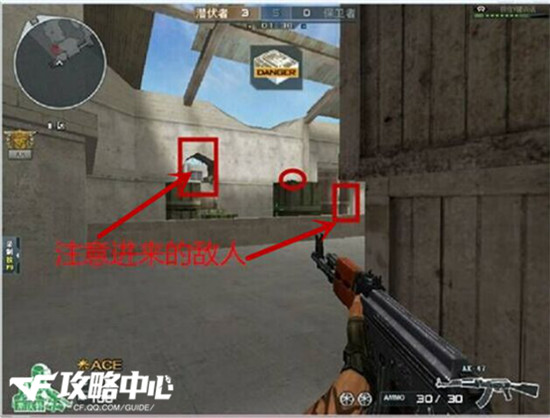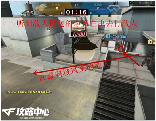 如图:“在这个位置卡点是可以听到轻微拆包声音的,但是为了稳妥起见,还是建议玩家每隔一会看一下。当然在注意自己身后通道有没有敌人来的同时,也要及时开火守包。”