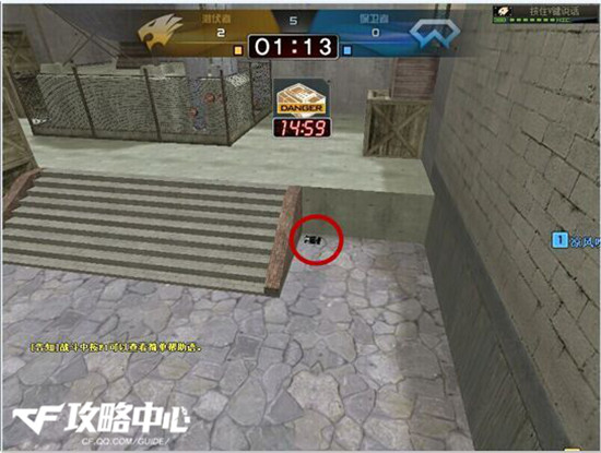 如图:“ 该点位下包尽量贴墙,防止别人在包点的铁箱子内偷包。自己迅速跑到这里躲着,等待敌人穿射也别理他,但是要注意在斜坡过来的敌人。等听到敌人拆包的声音后迅速出来击杀。”