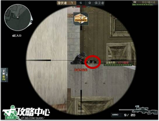 如图:“在这个点位敌人不会注意的搜这个点但是要注意,不要太靠近铁杆里,敌人第一时间可以在缝隙里发现自己。等听到敌人拆包的声音后,再出来打敌人侧身。”