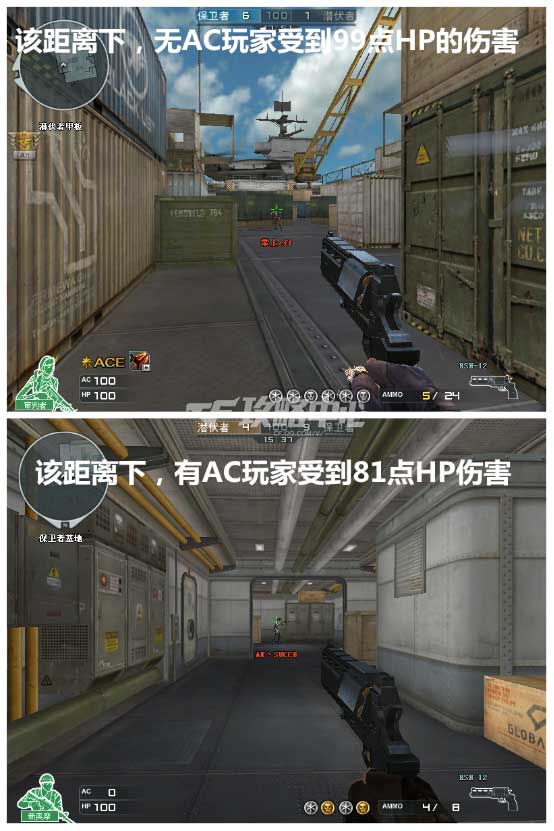 上图中两端距离大致相等,小编击中的同为胸部,无AC的玩家若被击中胸部会有99点HP的伤害,即使有AC,也会造成81点HP的伤害。这点还是相当可观的,若是在上图距离中被击中头部,便会致死。这点让小编想到一把散弹枪:贝雷塔,贝雷塔同样也是近距离秒杀,中远距离爆头必死,看来它有望成为手枪版贝雷塔。