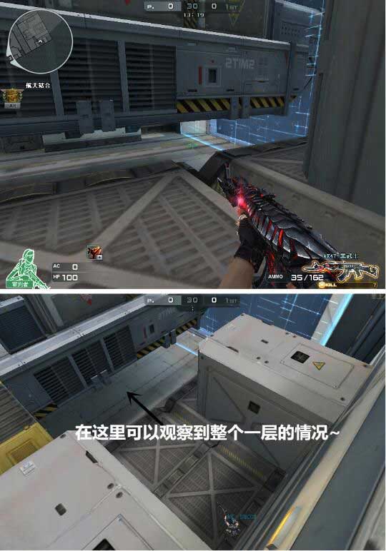 点位分析:这是一个既猥琐又能收割人头的点位。由于两个储物箱具有一定的高度,这个点又深在内部,一般人很难察觉。并且准星瞄准航天站一层,只要有玩家复活,你都可以击杀他们,由于地形原因,在这个点的玩家很占优势,而地面上的玩家则很难瞄准只露出一小部分身体的你。