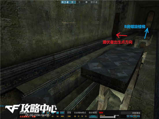 潜伏者的出身点位置比较高,可以说是在地图的最高一层。在潜伏者出身点的外面就是许多的跳台可以供幽灵跳到对面,下面就是保卫者出身点A点正大门出来的中路和大厅,可以说是和保卫者交锋的最有可能性的场所。