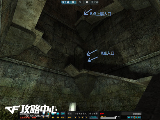 从B点入口进去后是一个没有任何掩体的上坡走廊,走出走廊就是B包点,这里前进十分考验潜伏者的跳跃和走位功底,因为在没有掩体的情况下要做到快速的无声移动,一旦鬼跳出现失误中断会极易容易被保卫者发现。B点上层入口进入后是B点上层的暗道,直接通到B点正上方的两条断石。