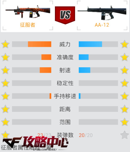 我们将征服者和外形极为相似的AA12做一下简单对比,从威力、准确度和射速三个方面来看的话,征服者和AA12几乎平分秋色差距并不明显,要说差距较大的地方就是征服者的装弹数量比AA12多出三发,这也就使得征服者在实战中更占据优势,综合来看征服者略胜一筹。