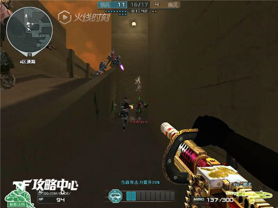 接下来再说一下A点平台这个位置,防守这里就需要靠一点技术了,首先上这个平台的路是一条小路,如果玩家缩在平台里是攻击不到小路上的敌人的,而如果站在边沿上,固然能起到防守小道的作用,但是同时也把自己暴露在了敌人的攻击范围之内,很容易被下面的生化幽灵抓伤或者被矮子的雷震下去,所以守这里的玩家需要眼观四路,耳听八方,有矮子扔雷就往平台里跳。