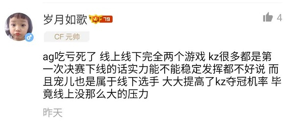 @岁月如歌:ag吃亏死了,线上线下完全两个游戏,kz很多都是第一次决赛,线下的话实力能不能稳定发挥都不好说,而且宠儿也是属于线下选手,大大提高了kz夺冠几率,毕竟线上没那么大的压力