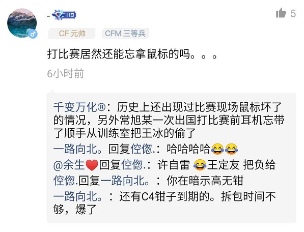@千变万化:历史上还出现过比赛现场鼠标坏了的情况,另外常旭某一次出国打比赛前耳机忘带了,顺手从训练师把王兵的偷了