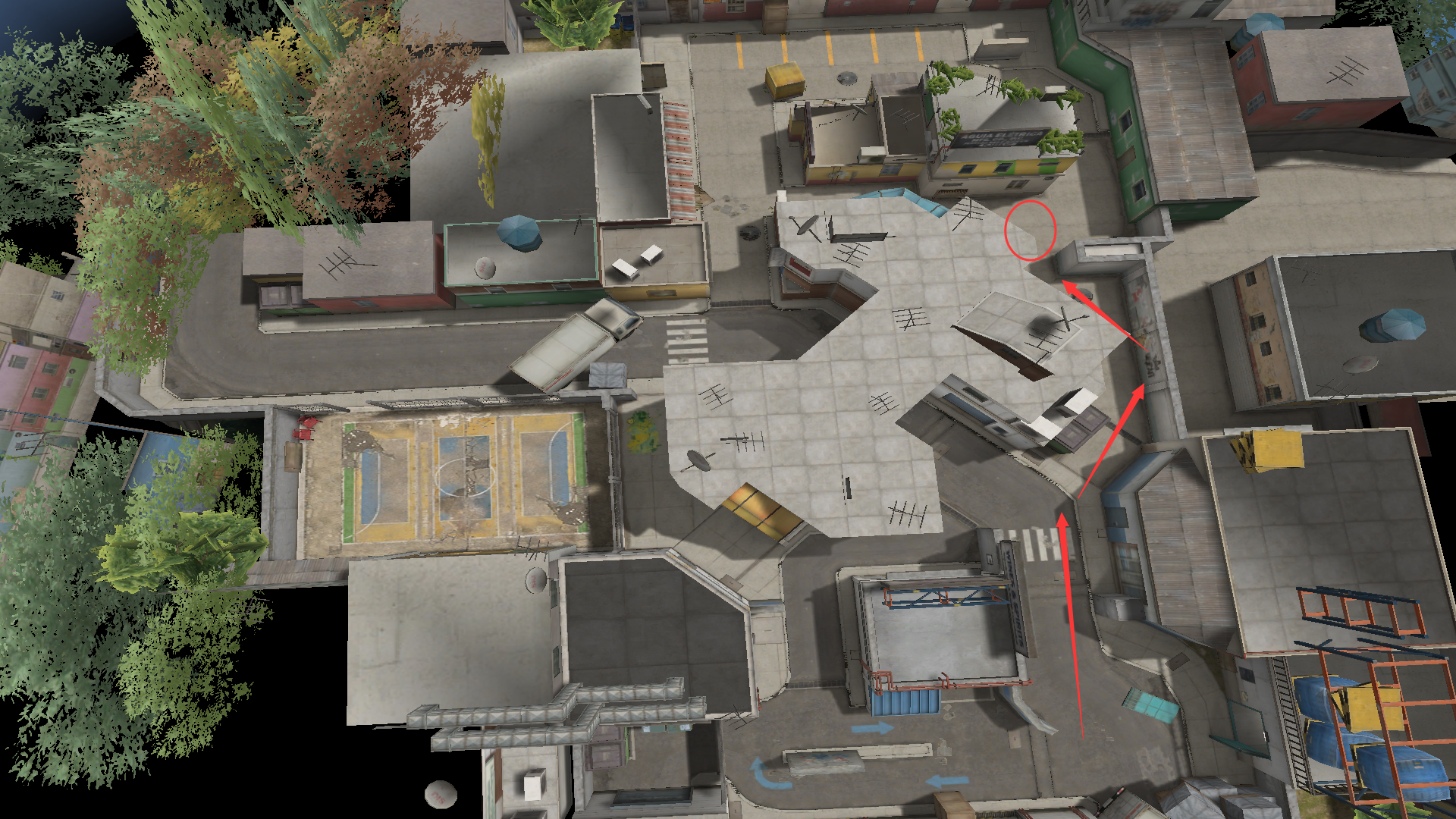 关键点在于按照行进路线前顶至保卫者阵营的二层楼楼梯下,看住图示红圈区。这里通道狭窄,十分适合霰弹枪的中近距离战斗。将战斗节奏控制好,这里将成为“刷屏”点位。