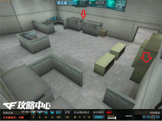 从图中我们可以看出A包点掩体非常多,这种地形很适合双卡,我们尽量不要躲在电脑桌里面,潜伏着在不进入A门的情况下就可以穿点,这样非常危险,所以我建议在A区进行一个双卡,与队友进行一个合理的配合及时给队友拉枪,只要敌人进攻A门就等于自投罗网!