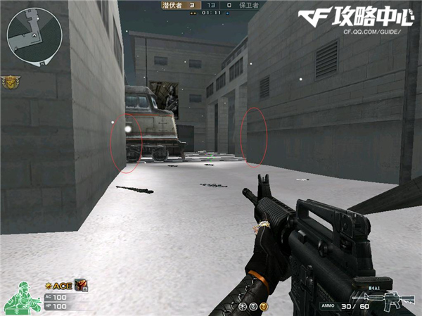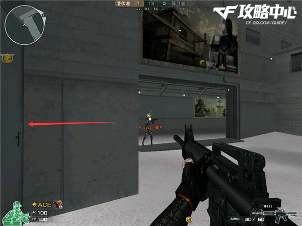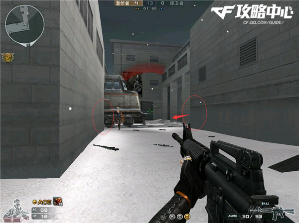 和上一个点位一样,开局之后从复活点左路直接冲出去,捡到第一把m4后阴在如图所示的墙角里。