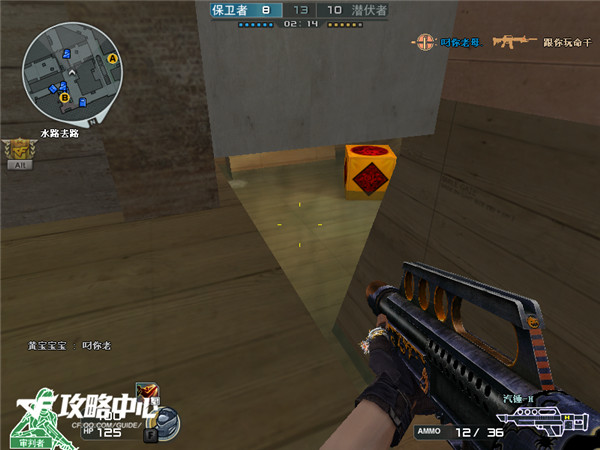 保卫者可以在A拐处的箱子后面进行防守,武器推荐使用喷子,因为喷子武器威力大,且攻击范围广,但缺点也很明显不适合远距离攻击,而此点位可以避其喷子的短处,只需要通过耳麦听其脚步,如果有人可以等靠近在突然跳出来进行攻击,可以起到意想不到的效果,如果没有声音也是有可能敌人静步来到A拐,我们可以看空气中的弹道,会有子弹飞过,那就是已经临近了,攻击即可。