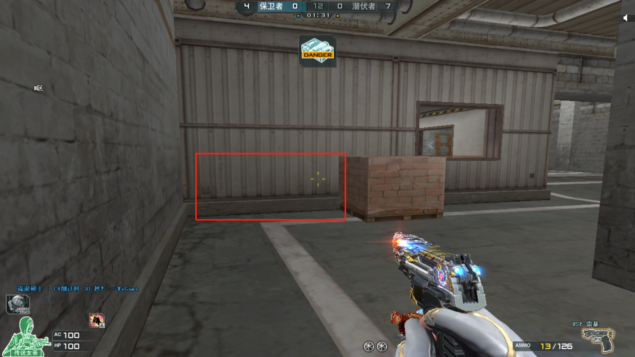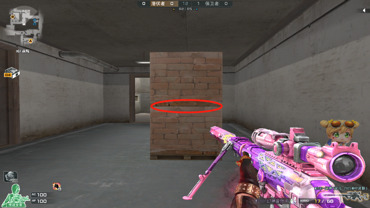 如果敌人将C4设置在上图附近的位置(一般来说这种为B小包,即敌人在B小附近看包),作为保卫者,可以在此包的墙后,也就是上图墙体左侧做到“隔墙拆包”!