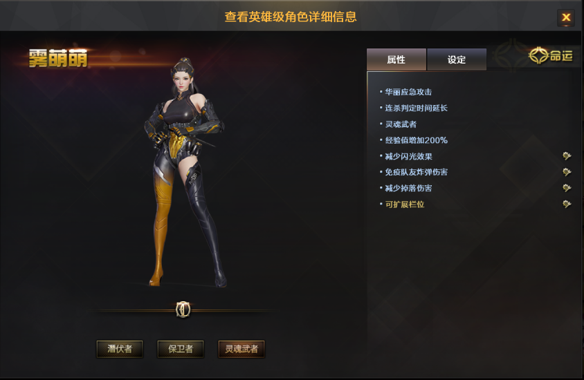 除了外观之外,雾萌萌的属性比较其他命运级角色而言相对稳定和实用!作为一款3+1型角色,拥有华丽应急攻击、连杀判定时间延长及常规三防等属性。想要打造更加强悍、更符合个人需求的配置,小伙伴可使用[英雄级角色属性扩展券]开启第四个属性槽位来提升雾萌萌的属性设定。