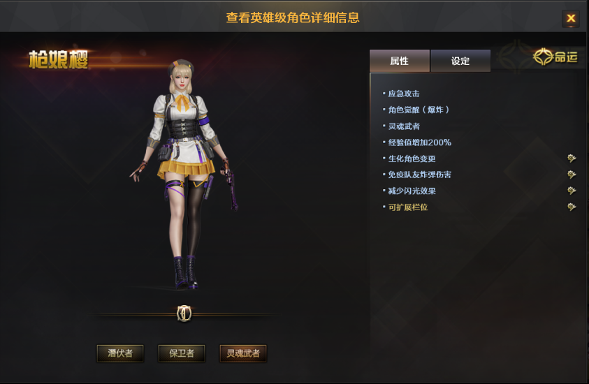命运级角色枪娘樱的属性也十分卓越,在传承了原樱的方向。3+1命运级功能型角色拥有应急攻击、角色觉醒(爆炸)及生化角色变更等属性。CFer也可根据个人需要解锁第4个属性槽位,开启更加强大的角色属性配置,助力你在战场上所向披靡。