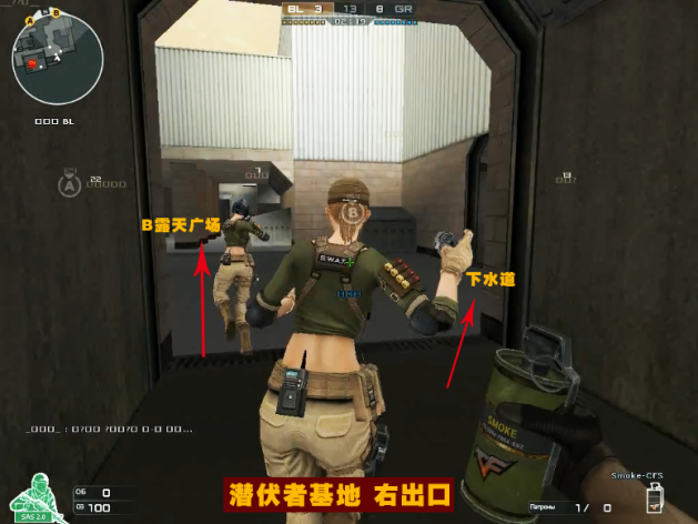 潜伏者基地左边出口通往集市→A点,右边出口可以通往下水道和B点