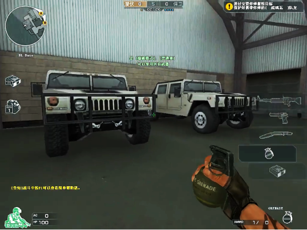 潜伏者基地为一个大型的盖篷式仓库,三台大型的军用越野车赫然停放,造型美观、气势磅礴,另外仓库还有一些军事物资箱、油桶等必不可少的元素。