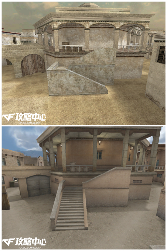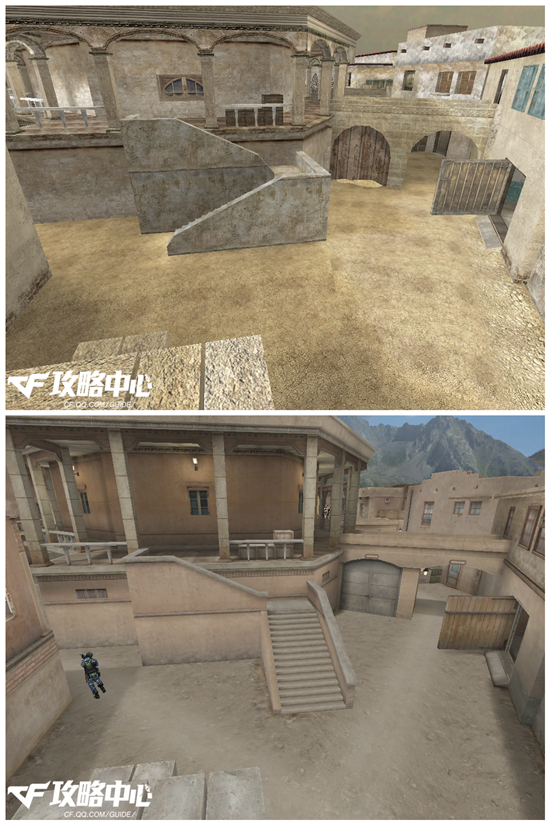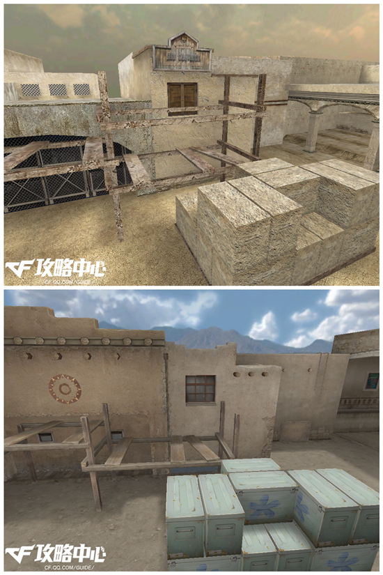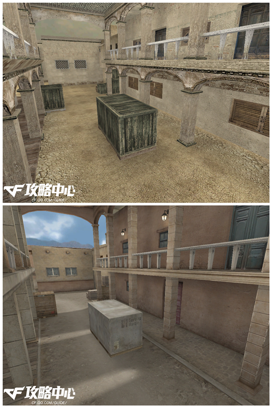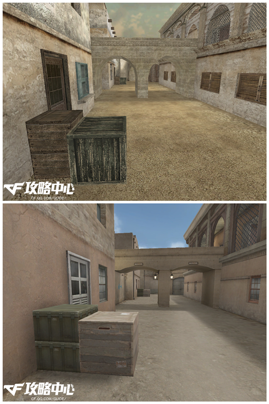 主道一直是职业选手必争之地,从两图对比就可以明显的看到,中间的箱子变了!不仅仅是木箱子变成了混泥土障碍物,木箱子是可以穿透射击的,而这么厚的混泥土是无法穿透的。老版的中间这地方被M4A1穿的很惨,新版的这个地方还可以当做掩体!这个改变对于M4A1玩家来说稍有影响,不过双方都穿不了所以也非常平衡!