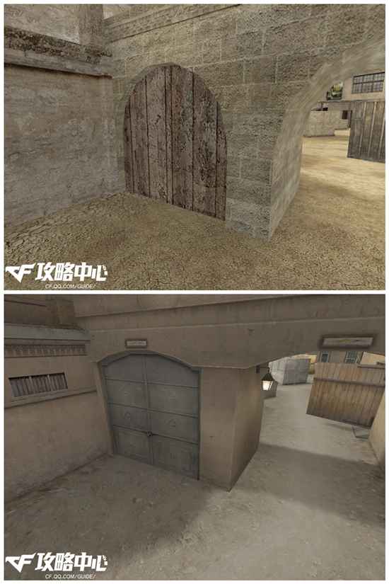 老版本的副道有这里是木门,从视觉感觉木质是可以穿透的,令许多玩家在此射击, 以为能穿到木门后面的敌人。实际上根本穿不了,这就是视觉的诱导!新版这个木门变成了铁质钢铁门,视觉上再也不会觉得可以穿透了。这一点对于不熟悉沙漠1TD的玩家来说非常好!