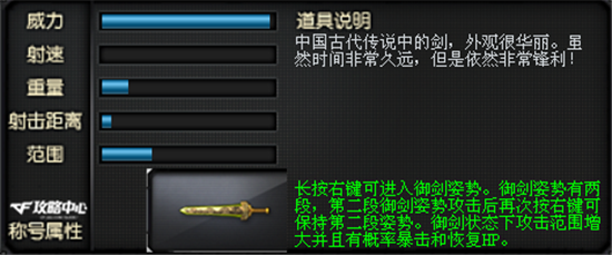 破天斩魔剑的官方介绍中关于该款武器的属性介绍很详细,将该款武器的重击分为了两段:第一段是玩家平时在PVP模式中经常见到的常规重击,御剑后将剑上劈完成重击;而第二段则是在挑战模式中才能见到的,第一段攻击完成后再次按下右键,即可出现刺剑的姿势。该状态下只要衔接熟练,重击的CD可以说是非常短的。作为火线币武器的大宝剑拥有如此众多的特殊属性加成,足以见火线币武器之诚意。