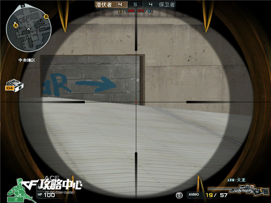 这个点位也是B包点一个看守C4最好的位置,首先将C4安放在B包点最外边缘,然后就可以到B连的箱子处躲好了,当然需要同时看守保卫者中路小门回防的敌人,并不时侦查B包点是否有人拆除C4(建议有一个潜伏者在B包点看守C4这样就万无一失了),当侦察到保卫者拆除C4时就可以使用狙击枪将敌人击杀,如果敌人躲在箱子后拆包也没问题,因为那个箱子是可以穿透的,所以巴雷特的好处就显示出来了。