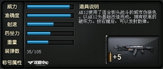 同时两者又都拥有着右键特殊属性选择,恶棍系列正式将一枪多用的思想应用在了枪械中,幽灵系列则更取长补短,头一次将霰弹枪与AK12结合;攻击距离可长可短,防守进攻转换可进可退。而AK12又与AK的威力相同,爆头都是无视AC,在弹道方面表现的比AK47前辈要稳些许,点射与扫射都能让玩家轻松驾驭;缺点则是点射时会有子弹向右偏移现象,但掌握它的弹道后相信它会成为继AK47、HK417后AK大手中又一款爆头利器。