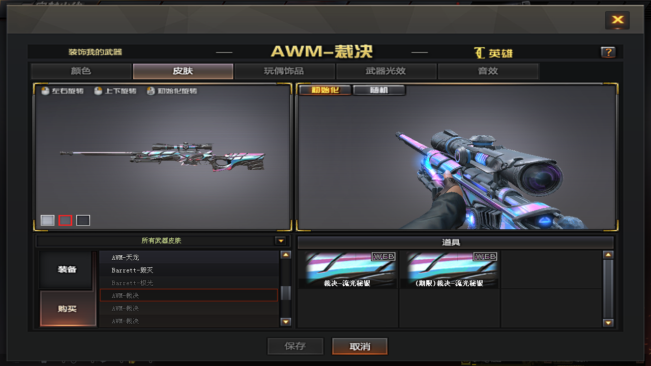 AWM-裁决的首款皮肤道具,装配后枪械外观变化非常大,并且加入了渐变光效&枪身动态特效。