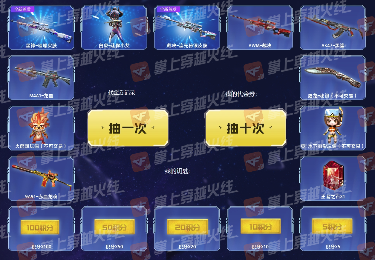 本次活动奖池内,不仅有全新首发星神&裁决皮肤,还有超稀有高价值道具,星神光效兑换券。从武器到皮肤,再到光效以及玩偶,种类较为齐全,可以满足不同CFer的道具需求。