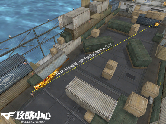如其他AK47一样,骑士AK的极限爆头距离也是在65米左右。如图中的虚线标记的距离,运输船对角都要出来一点点才能一枪爆头无视AC喔!这个距离可以做到大多数的清空下都能一枪爆头秒杀,距离超过65米也没多大关系、骑士AK47的速点非常优秀,直接两发速点即可击杀敌人、 (如果一发不行,那就两发。)