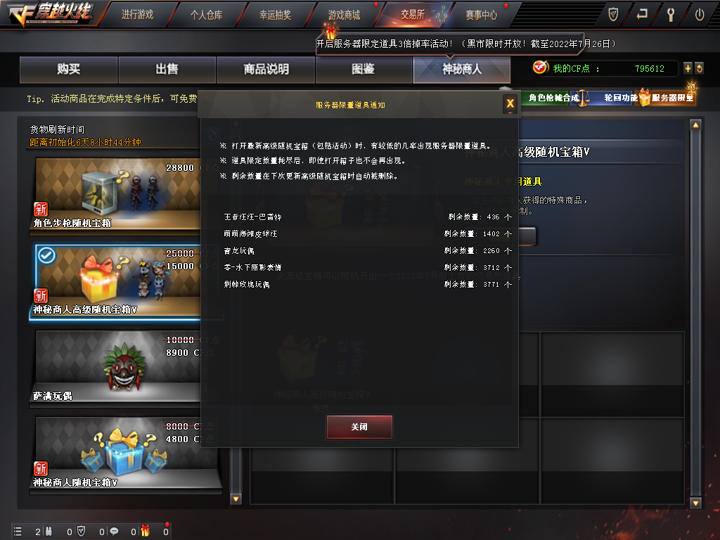 神秘商人V宝箱售价低,服务器限量道具的数量显著提升,在二者的综合作用下,在神秘商人V开启前期产出的服务器限量道具会比以往更多。因此,这一批的服务器限量道具的价格,相较于以往会有不同程度的起伏。