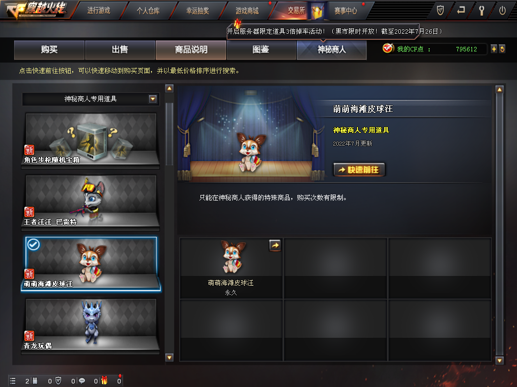 哈喽,各位CFer大家好呀~又见面啦,随着神秘商人V的到来,新一期服务器限量道具也将同步上新。经过前几期的不断探索,本次神秘商人V服务器限量道具在数量上有很大的增加。这再不搞一个说不过了吧?