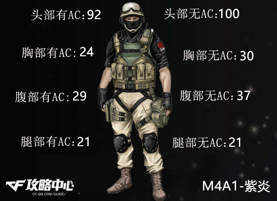 从武器威力中可以看出,虽然M4A1-紫炎在敌人没有装备防弹头盔的情况下可以一枪爆头,但也继承了M4家族无法破盔的遗憾,只能造成92-96HP之间的尴尬伤害值。其对于敌人上半身的伤害最高可达37HP,但一般情况下还是24-30HP比较常见。也就是说即便不爆头,只需四颗子弹就能带走一个满血的敌人。至于它的穿透力依旧是一大强项,当然这也是整个M4系列备受大家欢迎的原因之一。