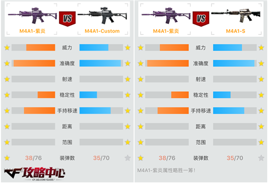 由于紫炎登场的次数较少,因此我们将它与原型M4A1-Custom和老牌王者M4A1-S进行对比。从武器对比图中可以看出,紫炎与它们相比是丝毫不占下风的。也就是说,它完全继承了M4A1家族的优劣之处。除此之外,它还将每个弹夹扩充到了38发子弹,这一点除了黄金M4A1之外是没有几把武器可以赶得上的。