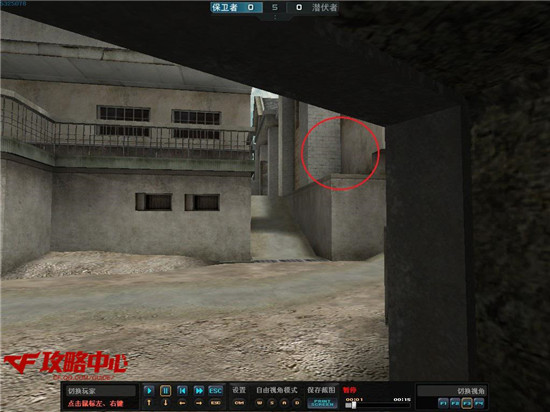 守在A点的保卫者要注意提防从中路小道迂回过来的潜伏者。并且在红圈内的位置,如果有潜伏者跳到红圈处那他是可以很轻松地看到A点内三分之一的区域的,所以保卫者在没有防备的情况下可能会被突然跳到此处的潜伏者击杀