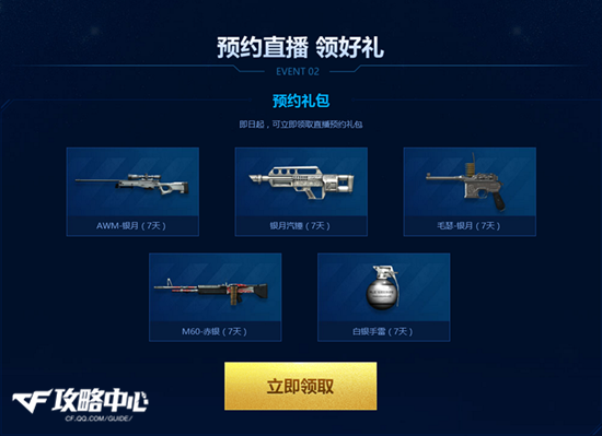 首先是一个银光闪闪的预约礼包!其中不仅包含有银月家族的全部成员:AWM-银月、毛瑟-银月和银月汽锤。还有白银系列的投掷武器,以及M60-赤银。可以说,除了银色杀手系列的枪械之外,其它所有以“银”为名的武器基本都有成员在其中。而且不需要任何的条件限制喔,来到页面即可领取!