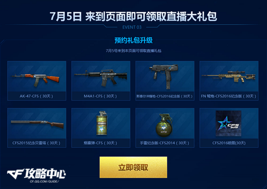 接下来登场的这款直播大礼包所包含的奖品就更为丰富了!其中有五把CFS纪念枪械、两款CFS投掷武器和CFS2016喷图。虽然它们与原版的GP武器相比并没有任何实质性的提升,但它们的纪念价值绝对是无法媲美的。尤其是当我们把两款步枪拿在手中时,对于我们的心理和手感都能产生很大的影响。至于它们的领取条件也十分简单,只需在7月5号之后即可将它们统统带走,而且全部是30天期限的!