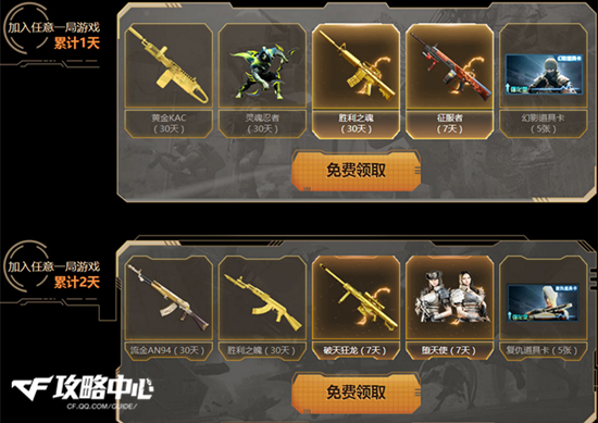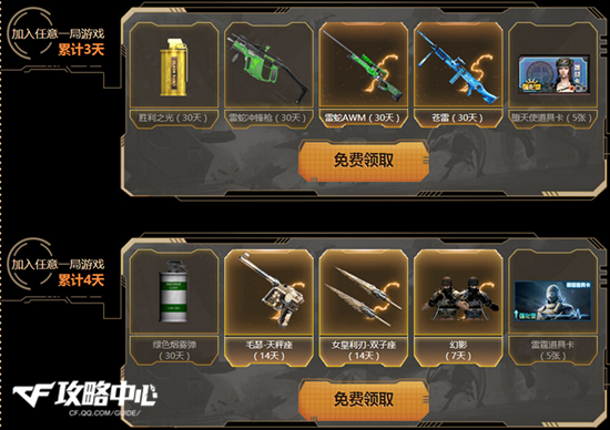 除了专属礼包之外,当我们每天加入任意一局游戏,即可领取相应礼包。其中最夺目的当属每个礼包中的五张道具卡了,加一起共有整整20张!至于其它方面,个人认为前两个礼包注重的是实用性,后两者则是更倾向于纪念意义。在前两个礼包中不仅有胜利系列,还有征服者和破天狂龙等,而堕天使和灵魂忍者同样也都很实用。后两个礼包中的雷蛇系列和星座武器以及第一款挑战强化武器和第一位强化角色都承载了许多回忆,希望大家都能将它们全部带走吧!