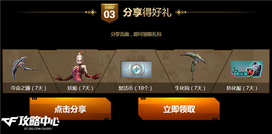 接下来则是一份分享礼包,只需我们分享页面,即可将这些生化道具统统带走。这四款道具的实用性就不必再多说了吧,可以助我们更好地玩转生化模式。至于那十个复活币,反正放****也不会到期,积累起来也是十分不错的。