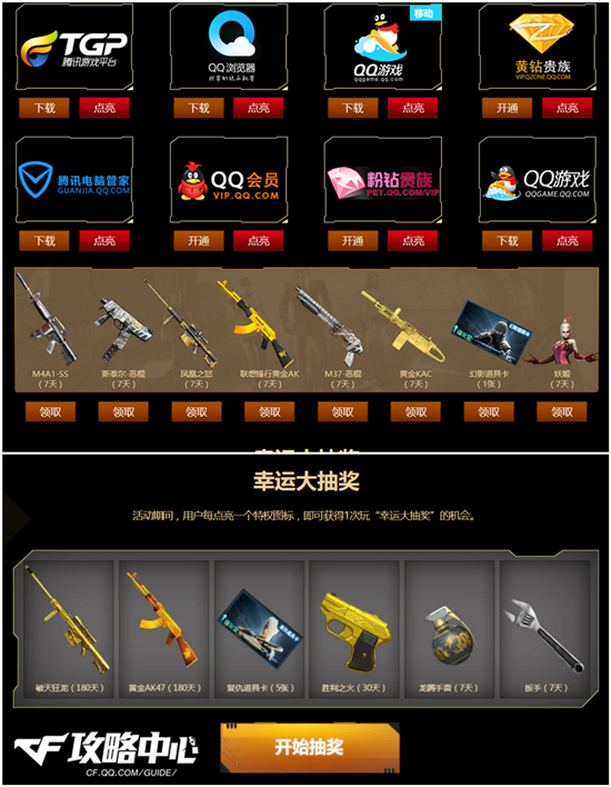 最后则是点亮对应的图标来获取领取装备的资格。其中不仅有M4A1-SS、M37-恶棍等极为实用的武器,还有凤凰之怒、联想锋行黄金AK等收藏价值较高的枪械,以及幻影道具卡和妖姬等道具。除此之外,每点亮一个特权图标还可获取一次玩“幸运大抽奖”的机会,说白了就是拼人品。不过奖池中的道具都很不错,欧皇们可以来试试能不能将180天的破天狂龙或是黄金AK47带走呢?