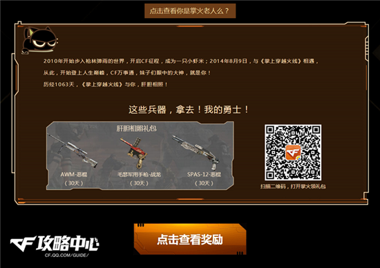 除了我们游戏的注册年限,根据与《掌上穿越火线》相遇的时间也可领取对应的礼包。其中不仅含有战龙毛瑟、翔龙手斧和MG3-翔龙这些经典的Royal系列,还有AWM-恶棍、SPAS-12-恶棍、Anaconda-左轮等恶棍家族成员;还有萨维奇100-雪原这一后起之秀和南瓜背包、QT手雷。不知道大家有没有很心动呢?