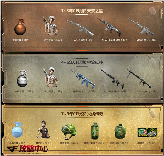 首先根据我们的注册年限,可以解锁对应的专属礼包:1-3年的玩家可以领取30天期限的青铜手雷、活力灵狐和狼牙武器系列;4-6年的玩家则是可以领取白银手雷、活力灵狐和迷彩系列;7-9年的玩家可领取水晶手雷、潜龙队和激浪套装。综合来看,三颗手雷的性能虽然相差无几,但所代表的荣耀却是依次递增。三把狼牙武器曾经也是火爆一时,而这些迷彩系列的武器虽然出场率低了一些,但它们每一位都很实用。至于激浪套装,可能已经勾起不少小伙伴的回忆了,恐怕没有经历过那段岁月的CFer是无法体会到喝激浪喝到吐的心情的!