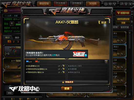 英雄级武器升级需要属性成长券和特殊属性重铸券,然后英雄级武器(现仅限英雄级AK和M4)在仓库的右下角增加一个武器升级的选项就是一个向上的箭头,其中属性成长券1000火线币一个,而特殊属性重铸券2000火线币一个,可见骑士辛辛苦苦一个月攒下的火线币其实想要购买英雄级武器的属性成长券也购买不了多少。