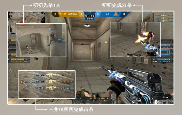 AE战队的老将三井在本届CFS上的登场,引起了无数老玩家的目光,在比赛中出色的表现让人眼前一亮,宝刀未老的三井除了能英勇杀敌,TK自己人也毫不手软。与山西Vivi交手,比分来到8:8,山西Vivi3人小道快攻,此时三井和DAODAO严防死守,面对对方的进攻,DAODAO从楼梯口跳下,率先杀掉了left,随后在与nose交手时,虽然也将对方击杀,奈何在后方的三井突施冷箭,在射杀nose时,顺带打死了DAODAO,一气呵成,丝毫不拖泥带水,TK成功。此时三井仰天长笑,看你小子还敢不敢抢我的人头……